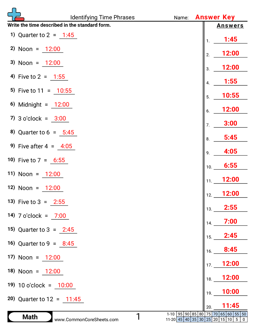 Each worksheet has 20 problems identifying commonly used phrases to tell time.