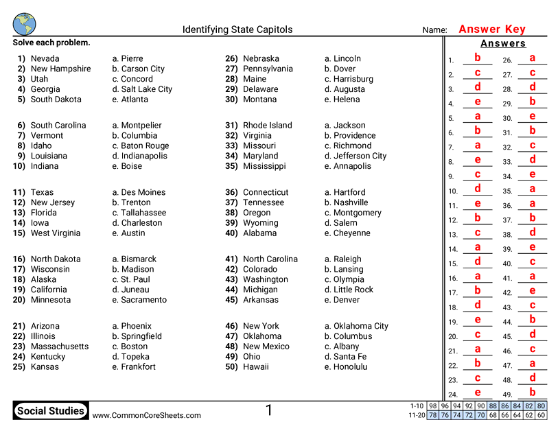 Free social studies worksheets on Identifying State Capitols. Each worksheet has 50 problems with an answer key and are ideal for teachers and homeschooling. You can download the PDF, create a set of flash cards or set it up for online learning.