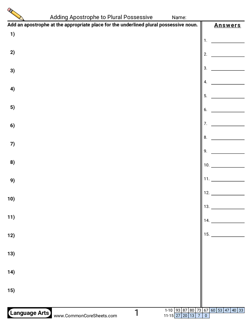 Free language arts worksheets on Adding Apostrophe to Plural Possessive. Each worksheet has 15 problems with an answer key and are ideal for teachers and homeschooling. You can download the PDF, create a set of flash cards or set it up for online learning.