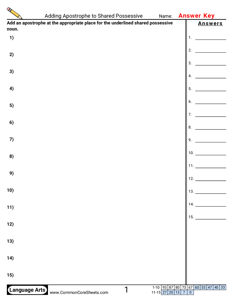 Free language arts worksheets on Adding Apostrophe to Shared Possessive. Each worksheet has 15 problems with an answer key and are ideal for teachers and homeschooling. You can download the PDF, create a set of flash cards or set it up for online learning.
