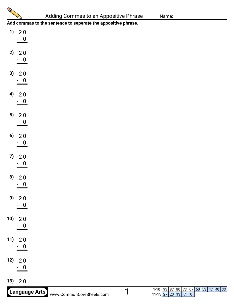 Free language arts worksheets on Adding Commas to an Appositive Phrase. Each worksheet has 15 problems with an answer key and are ideal for teachers and homeschooling. You can download the PDF, create a set of flash cards or set it up for online learning.