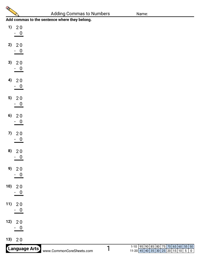 Free language arts worksheets on Adding Commas to Numbers. Each worksheet has 20 problems with an answer key and are ideal for teachers and homeschooling. You can download the PDF, create a set of flash cards or set it up for online learning.