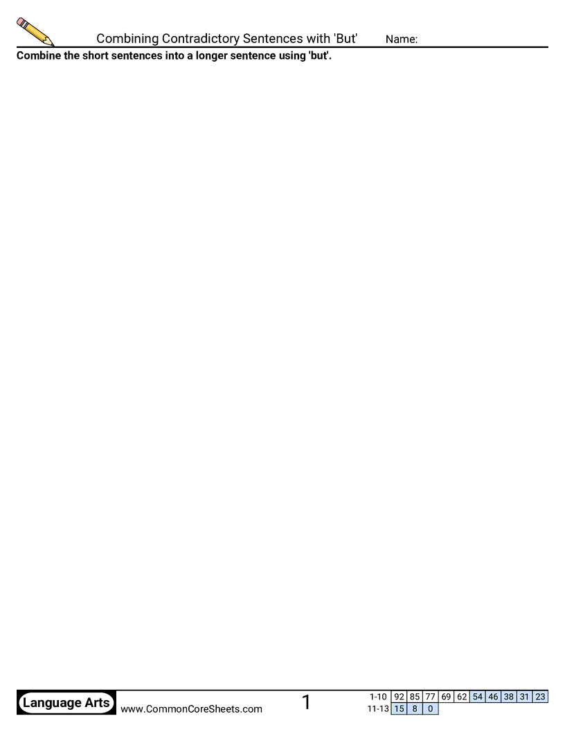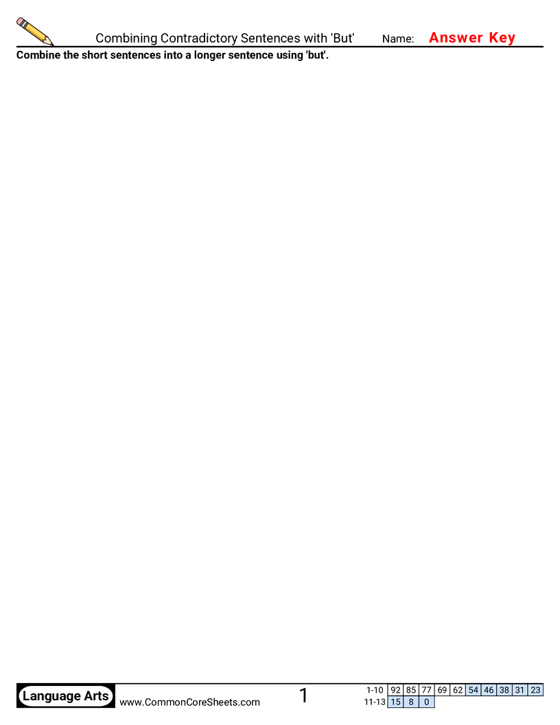Free language arts worksheets on Combining Contradictory Sentences with 'But'. Each worksheet has 13 problems with an answer key and are ideal for teachers and homeschooling. You can download the PDF, create a set of flash cards or set it up for online learning.