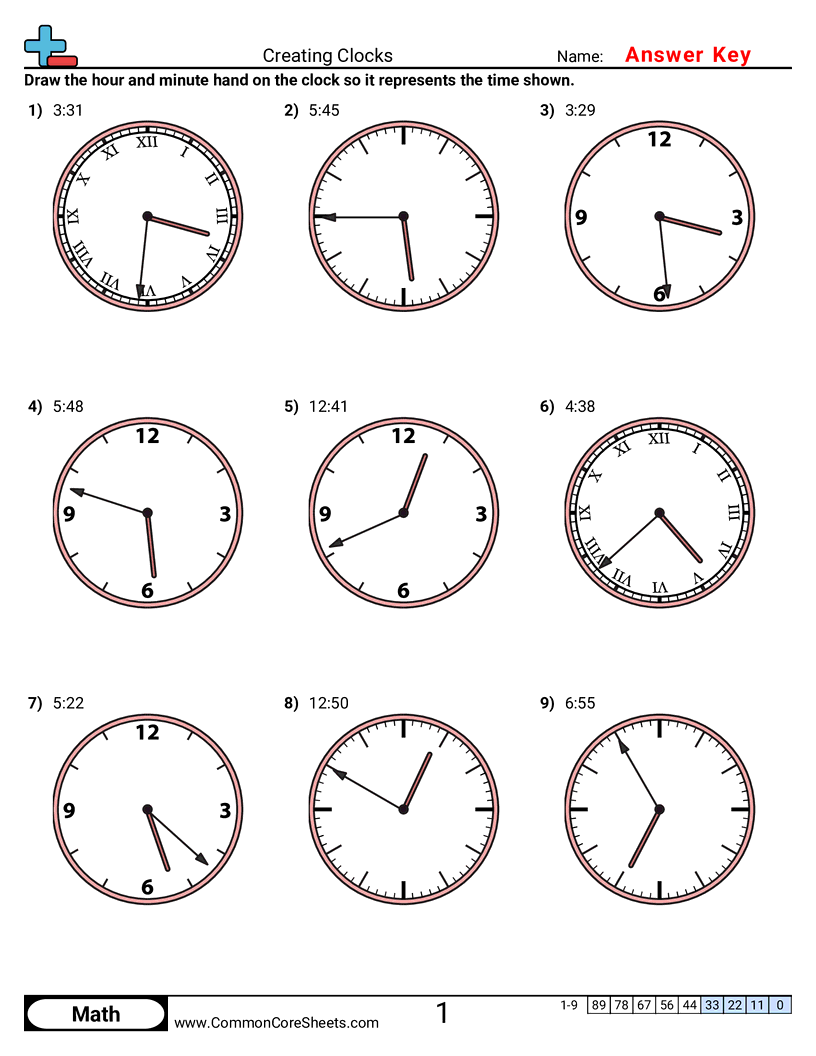 Free math worksheets on Creating Clocks. Each worksheet has 9 problems with an answer key and are ideal for teachers and homeschooling. You can download the PDF, create a set of flash cards or set it up for online learning.