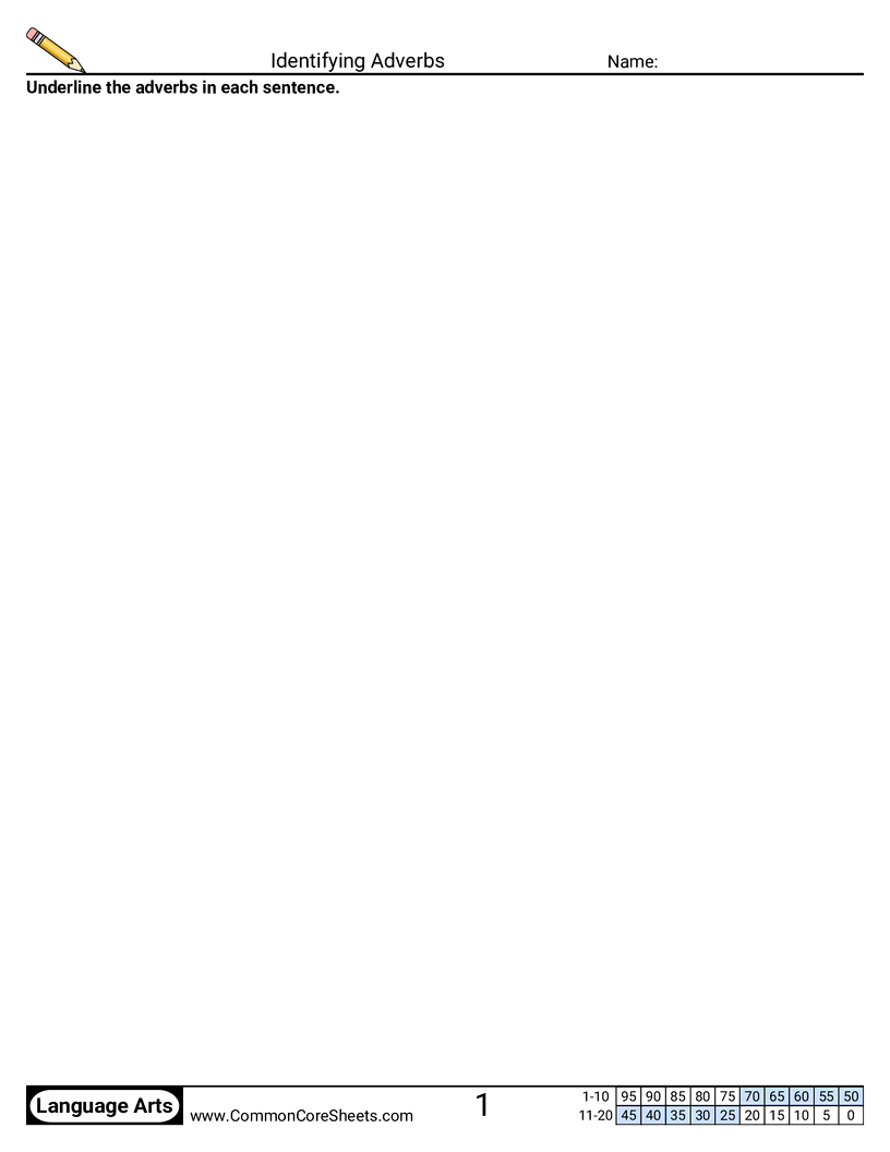 Free language arts worksheets on Identifying Adverbs . Each worksheet has 20 problems with an answer key and are ideal for teachers and homeschooling. You can download the PDF, create a set of flash cards or set it up for online learning.