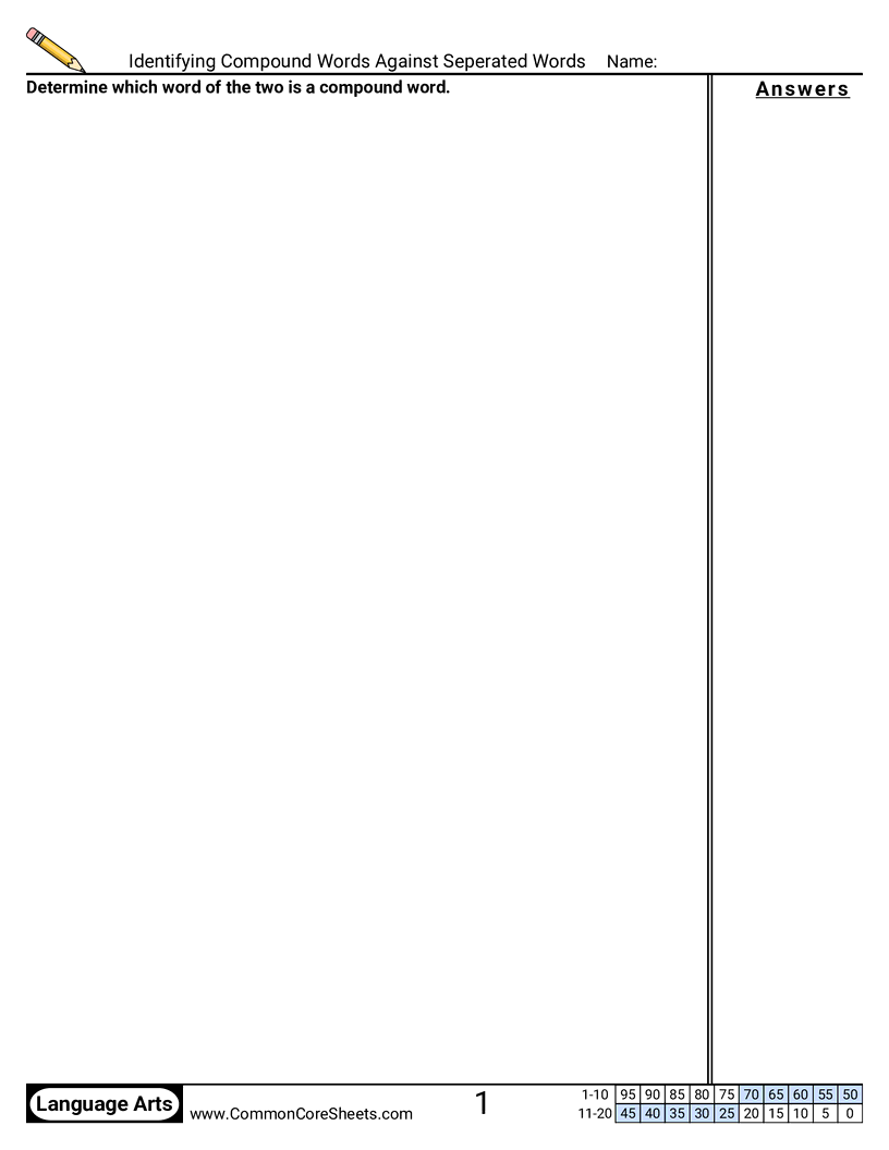 Free language arts worksheets on Identifying Compound Words Against Seperated Words. Each worksheet has 20 problems with an answer key and are ideal for teachers and homeschooling. You can download the PDF, create a set of flash cards or set it up for online learning.