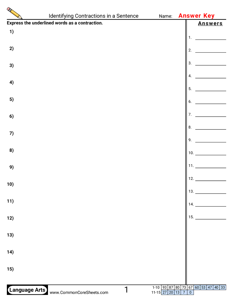 Free language arts worksheets on Identifying Contractions in a Sentence . Each worksheet has 15 problems with an answer key and are ideal for teachers and homeschooling. You can download the PDF, create a set of flash cards or set it up for online learning.