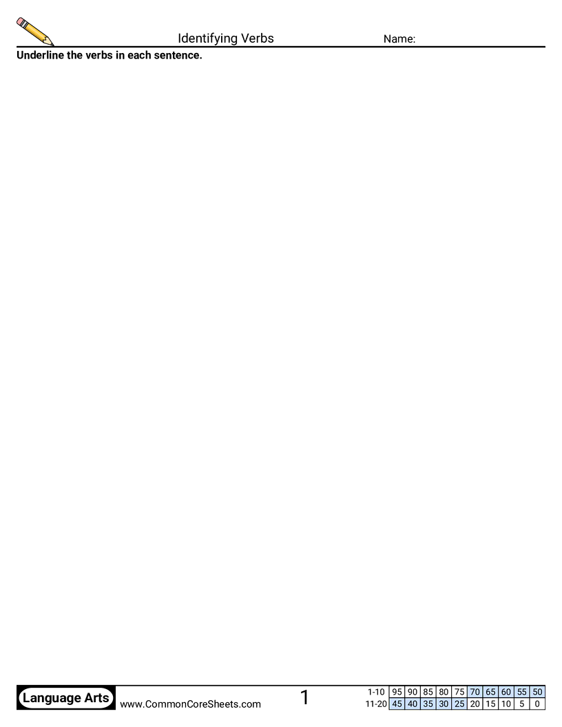Free language arts worksheets on Identifying Verbs . Each worksheet has 20 problems with an answer key and are ideal for teachers and homeschooling. You can download the PDF, create a set of flash cards or set it up for online learning.