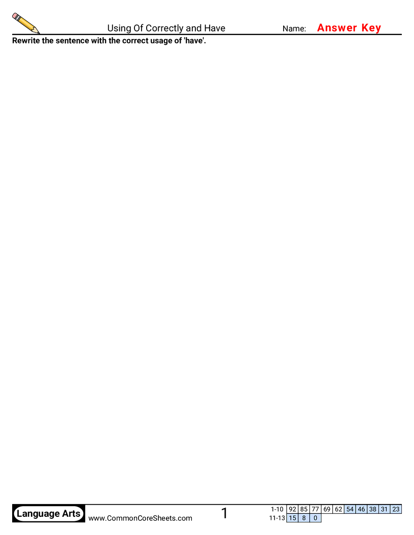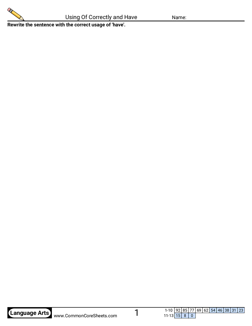 Free language arts worksheets on Using Of Correctly and Have. Each worksheet has 13 problems with an answer key and are ideal for teachers and homeschooling. You can download the PDF, create a set of flash cards or set it up for online learning.