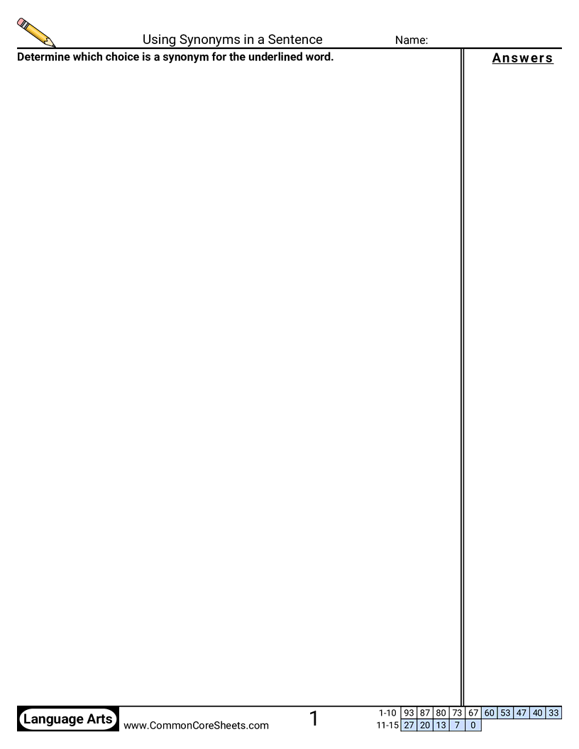Free language arts worksheets on Using Synonyms in a Sentence. Each worksheet has 15 problems with an answer key and are ideal for teachers and homeschooling. You can download the PDF, create a set of flash cards or set it up for online learning.